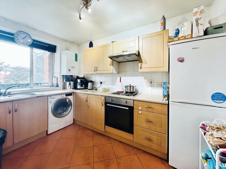 The flat features a well-proportioned reception room which is a true highlight of the property. The large windows flood the room with natural light, offering an inviting space for relaxation while providing a delightful view of the communal gardens.