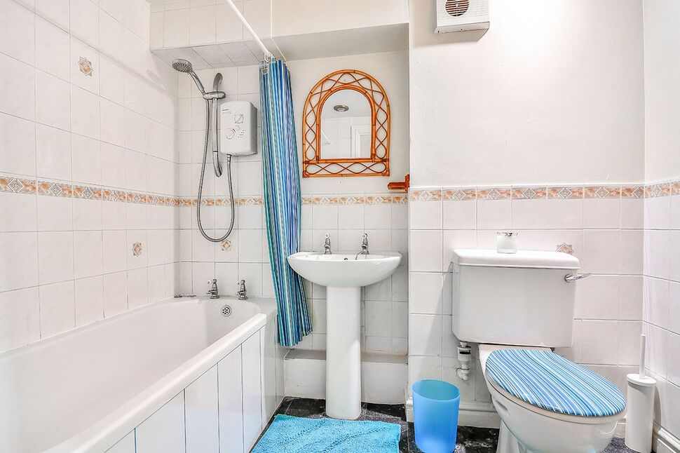 This three piece bathroom is fitted with a paneled bath with shower over, pedestal hand wash basin and a low flush WC. Finished with tile effect lino flooring, part tiled walls and a wall mounted mirrored medicine cabinet.