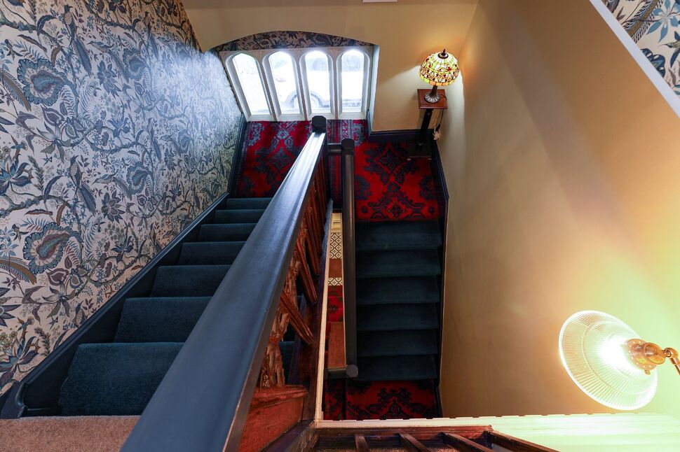 The impressive, gothic-style arched door opens to a private ground-floor hallway with storage space. The open winding staircase, with ornate oak balustrade, leads from here to the first of two further levels where the main living areas the house are found. A useful full height storage cupboard is located at the top of the staircase and a glass panelled doorway leads into the first-floor hallway.