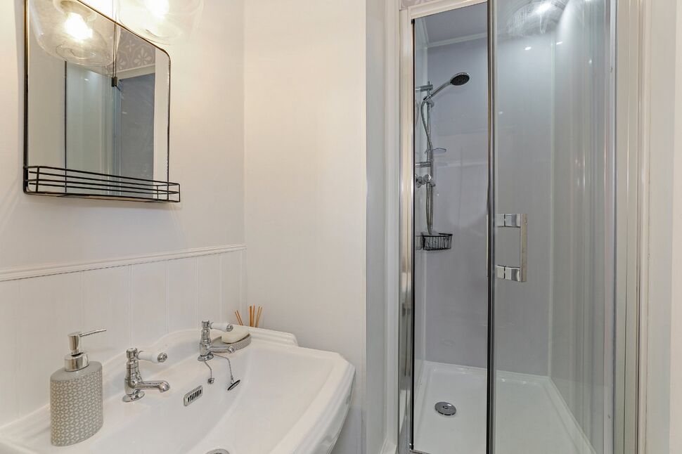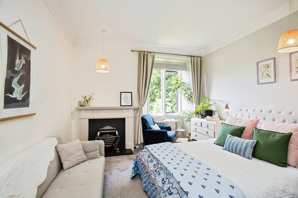 Also situated on the first floor, this large room is flooded with light and again benefits from fantastic views. Its features include an original Victorian cast-iron safe, fireplaceand cornicing. Floor to ceiling fitted wardrobe, traditional column radiator and ample furniture space.En-suite bathroom with enclosed shower cubicle and sink