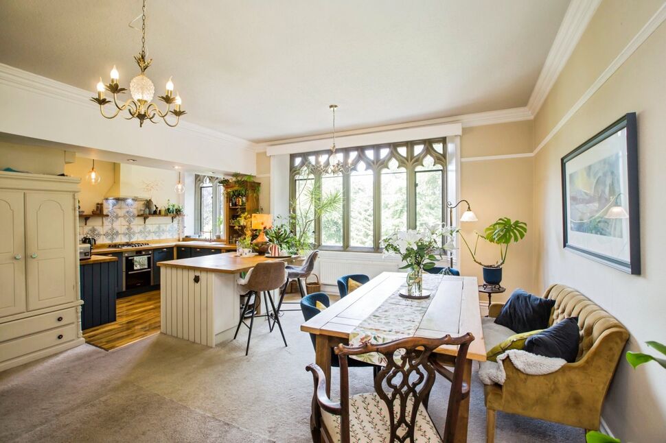 The living room has a dual aspect to the front and side of the house and looks across the grounds and hillside beyond. There is a lovely oriel-bay window, again with ornate metal framed windows. The gas stove sits in a beautiful limestone fire surround with matching hearth. A large space with ceiling rose, wood panelling and cornice.