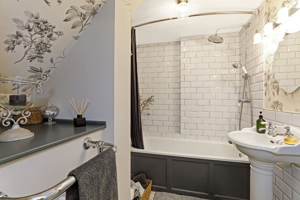 Family bathroom with tiled floor, panelled bath, over-bath Victorian style shower, WC and washbasin. Bespoke fitted cabinetry and additional storage area.
