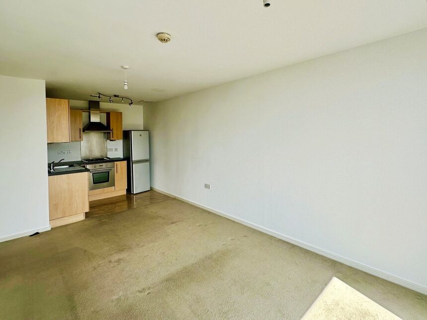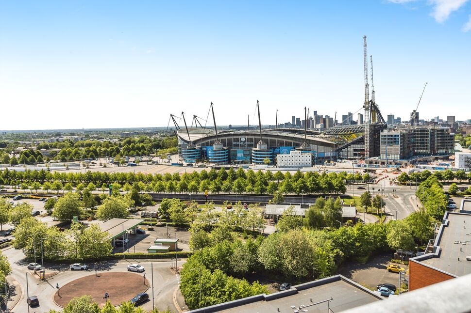 Sliding door to Juliet-style balcony offering superb distant views across the city with the Etihad stadium in the foreground. Living/dining area with carpeted floor and electric heating. Open-plan kitchen with fitted base and wall units, integral electric oven and hob with extractor hood, sink with mixer tap, worktop lighting, wine rack, vinyl-flooring, recess suitable for fridge/freezer.
