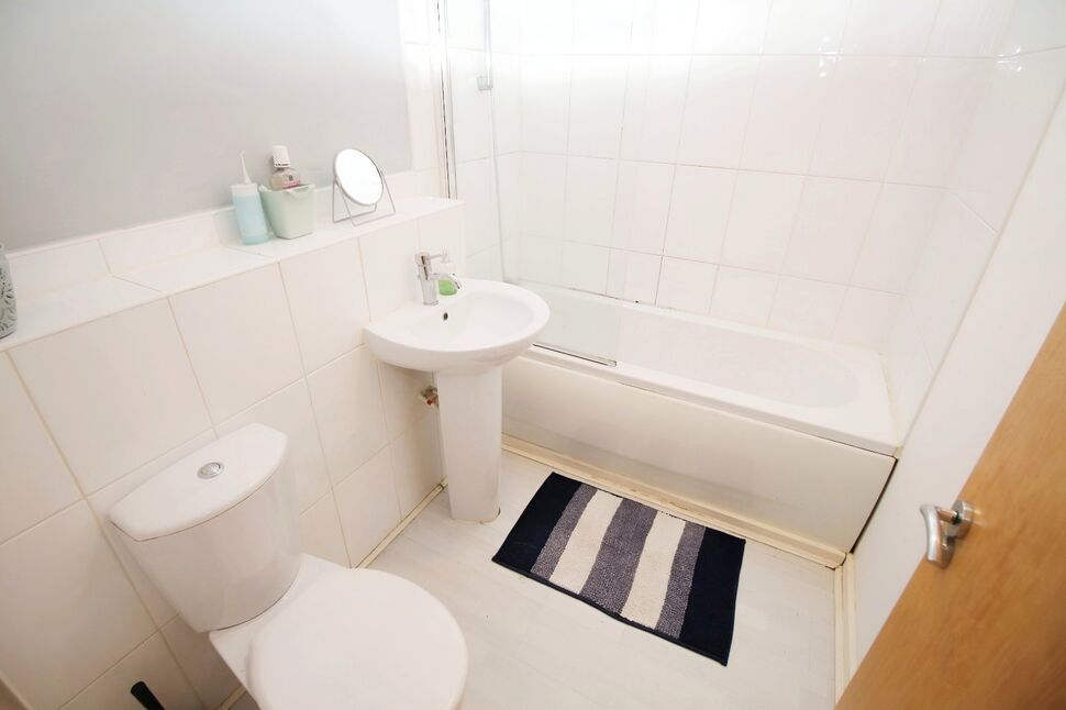 Fitted with a modern white three piece suite comprising panelled bath with shower and side screen over, low flush WC and pedestal hand basin. Fitted with ceramic wall tiling and a chrome heated towel rail.