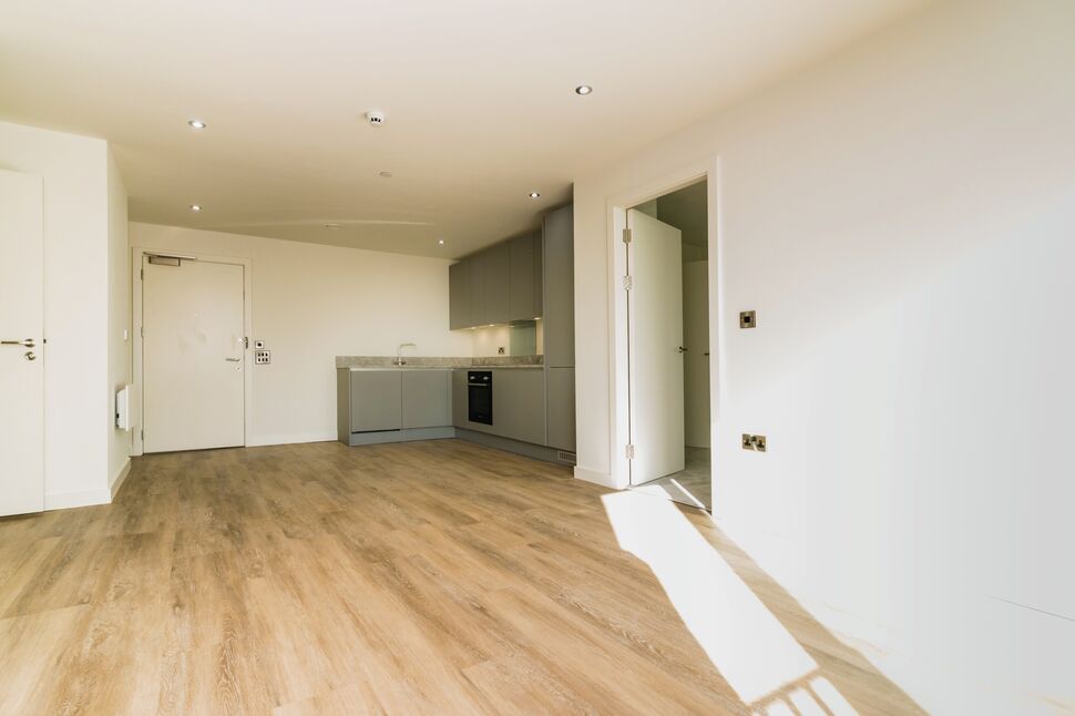 Open-plan layout. Full-height window with a Juliet balcony offering elevated cityscape views. Wood-effect flooring, two electric heaters, recessed downlighters, large storage cupboard housing the water heater. The kitchen area is fitted with a range of base and wall units, integral electric oven and hob with extractor, sink with mixer tap, integral fridge/freezer and dishwasher. Doors leading to: