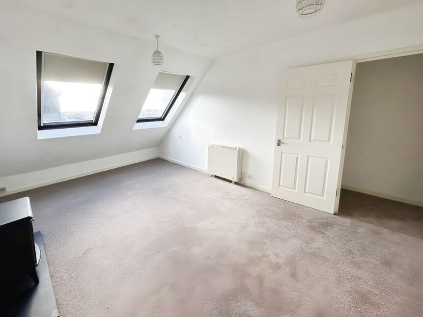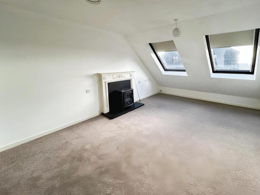 Carpeted flooring. Wall mounted electric storage heater. Feature fireplace with stone hearth and surround. Two velux windows to rear aspect. Archway into kitchen.