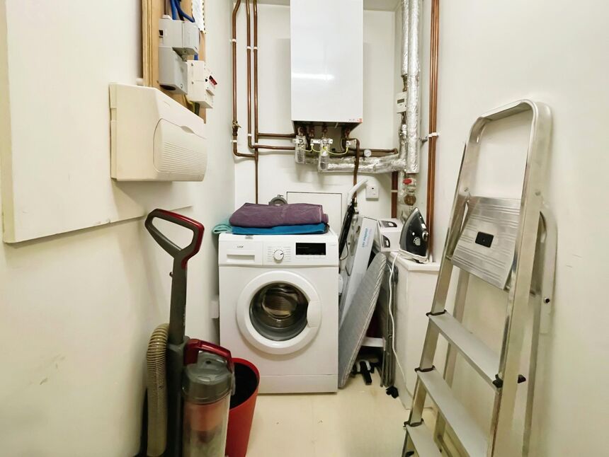Plumbed for a washing machine, storage space and boiler cupboard.