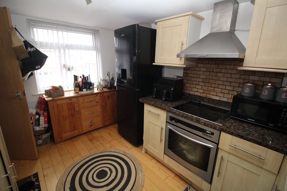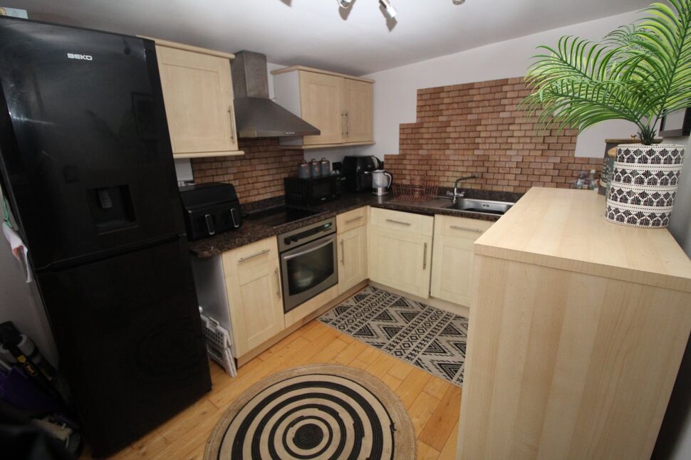 Offering wall and base units with complementing work surfaces over, wooden flooring, stainless steel sink and drainer with mixer tap over. Integrated electric oven, hob and extractor over. Power points, UPVC double glazed window to the front aspect. Tall fridge/ freezer and integrated dishwasher and combi washing machine and dryer.