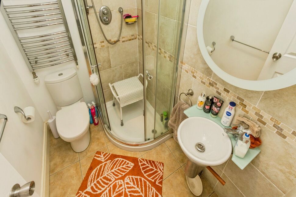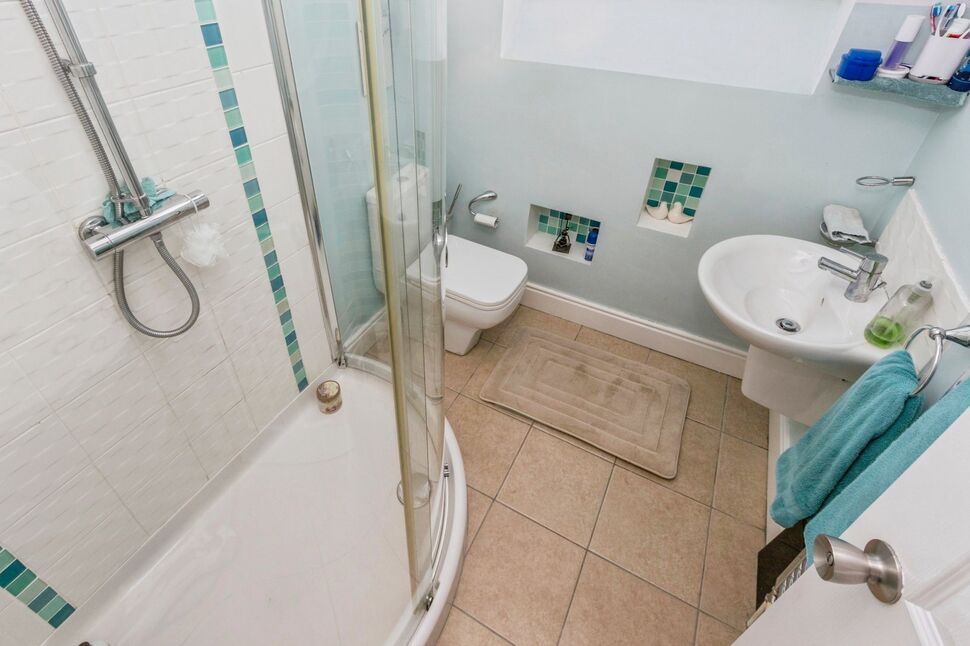 Three piece contemporary white suite comprising fully tiled enclosed shower cubicle with thermostatically controlled shower and Rain shower , dual flush WC, semi pedestal wash hand basin with mixer tap. Tiled floor and part tiled walls, heated towel rail, Velux window.