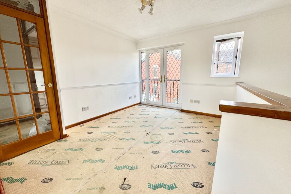 Impressive main reception room, enjoying a dual aspect with windows to the front and rear and French doors to the Juliet balcony. Electric heater.