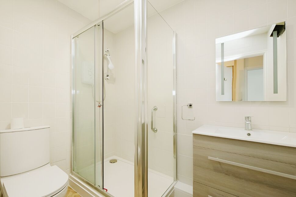 Low flush WC, walk in shower cubicle housing the electric shower, extractor fan, wash basin with draws beneath, wall mounted heater and fully tiled walls.
