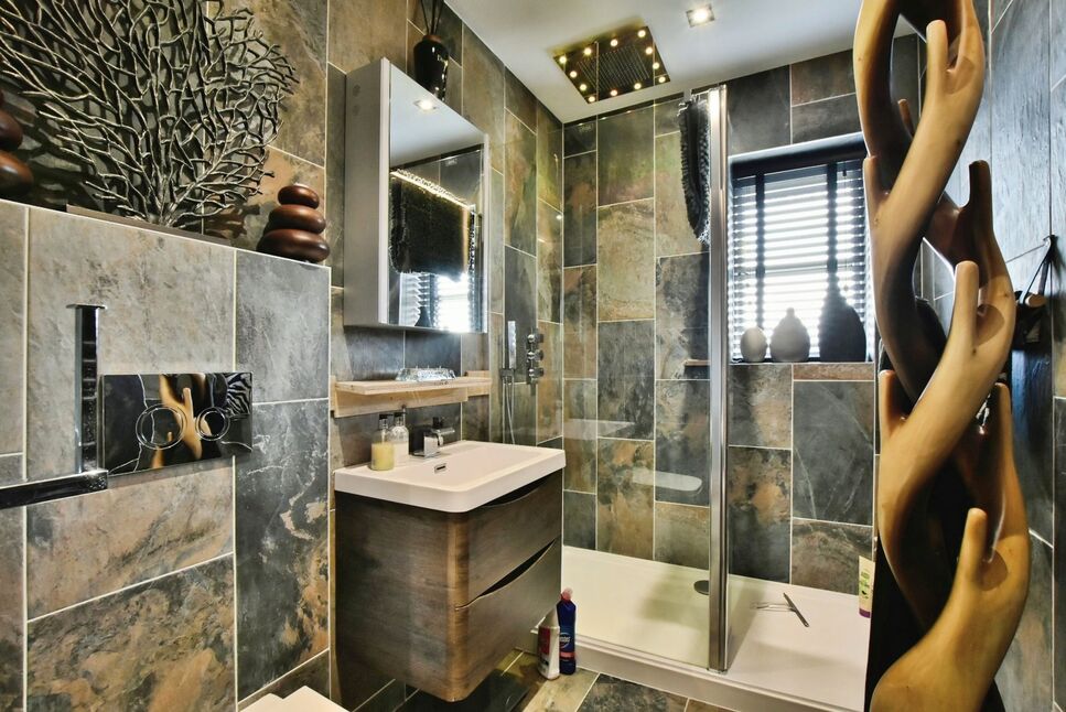 Bathroom with a large walk-in shower and integrated colour changing lights, rainfall shower head, and sound system. Black towel radiator, tiled flooring. airing cupboard. WC, wall hung wash hand basin.