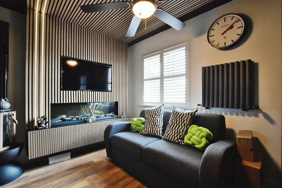 Bay window to the front elevation with plantation shutters. Media wall unit finished in matt black. LED strip mood lighting. Hard wood flooring. Column radiator, ceiling light/ fan. Wall lights.