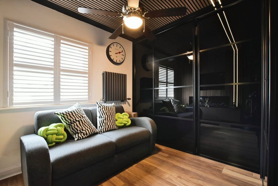 Acoustic decorative wall panelling, built-in storage, hard wood flooring.