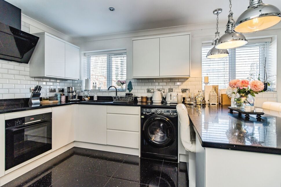 Two windows with pleasant water views. Fitted with a comprehensive range of wall and base units with work surfaces over incorporating a breakfast bar. Sink and drainer unit with mixer tap. Oven and four ring hob with extractor unit over. Plumbing for washing machine and space for fridge freezer. Tiled floor and part tiled walls. Spotlights to ceiling.