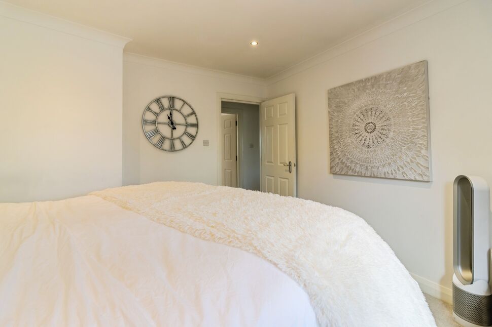 Fitted with a stylish two piece suite comprising; wash hand basin with mixer tap over and drawers underneath and WC. Large walk in shower cubicle. Tiled floor and walls. Large storage cupboard. Chrome heated towel rail. Spotlights to ceiling.