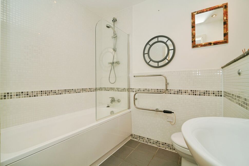 Fitted with a white three piece suite comprising; wash hand basin with mixer tap, bath with mixer tap, shower over and screen to the side and WC. Tiled floor and part tiled walls. Chrome heated towel rail. Spotlights to ceiling.
