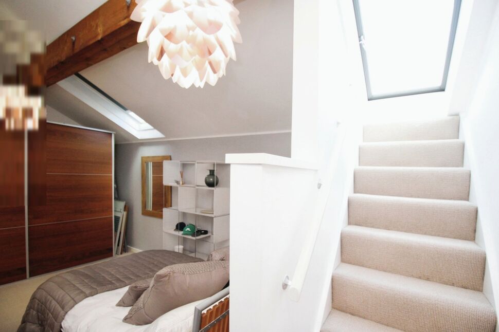 Spacious bedroom with vaulted ceiling. Sky light with fitted electric shutter blind. Electric heater. Steps leading to fire escape. Exposed ceiling beams.