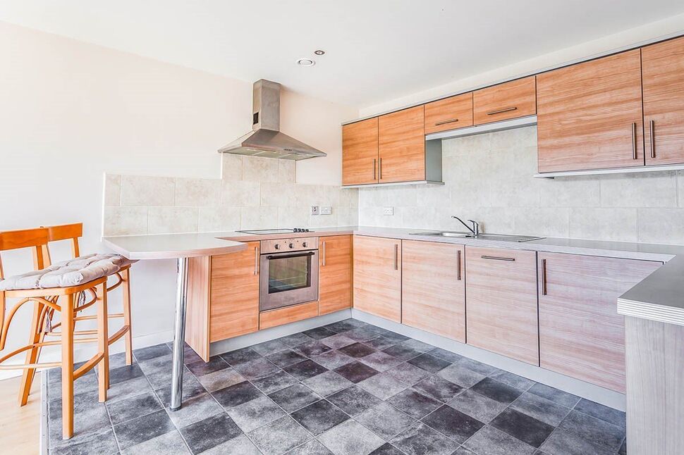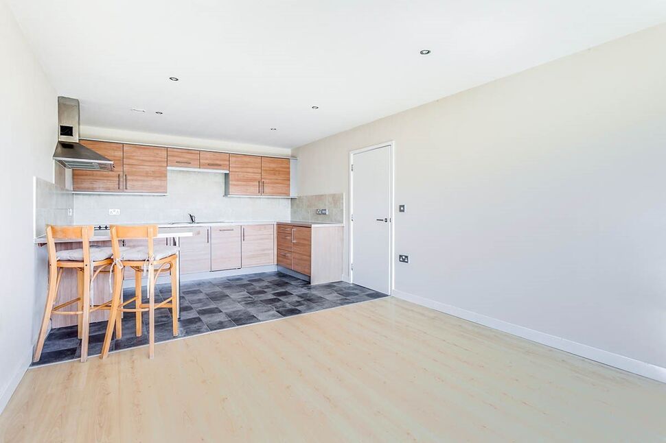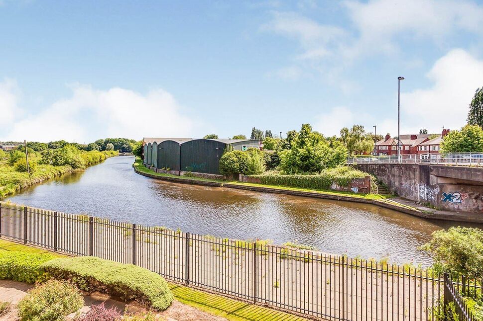 Beautiful open plan space with laminate flooring throughout. Double glazed window to rear aspect with balcony overlooking the canal having beautiful views. Electric wall heater. Ceiling downlighters. Superb fitted kitchen with modern medium oak effect units with complementary work surfaces. Integrated electric oven and hob with chimney style extractor fan, washer, fridge and dishwasher. Part tiled around work surface area. Stainless steel sink and drainer. Built-in breakfast bar.