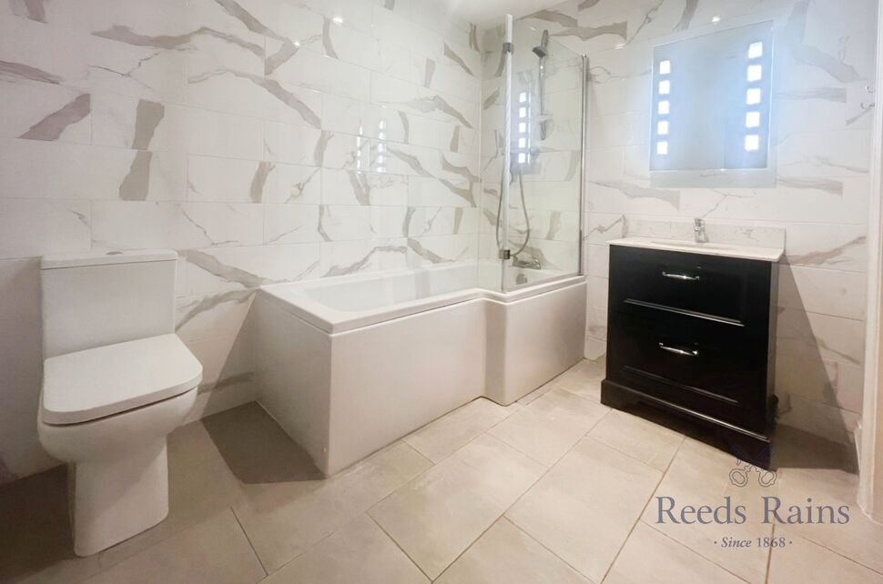 A lovely modern bathroom, recently installed, comprising a WC, a sink with vanity, a mirror with lights, and a bath with an overhead shower.