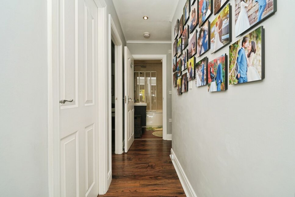 A welcoming entrance to the property with wooden-style flooring and electric heater. Two storage cupboards.