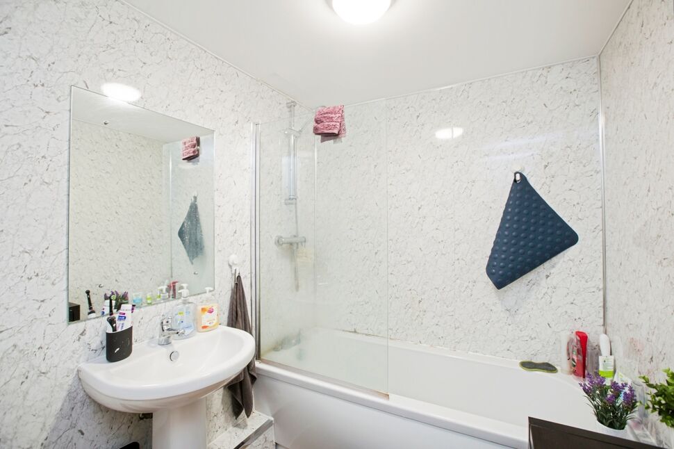 Stylish white three-piece suite comprising pedestal hand basin, panelled bath with overhead shower, and WC.