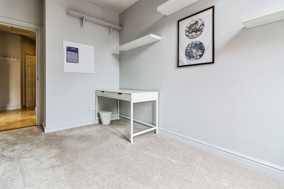 The superb living area wraps around the corner building, bathed in natural light from three large feature windows, offering a great cityscape view of similar neighbouring properties juxtaposed with more contemporary developments. The high ceiling adds to the sense of space, with ample scope for both lounge and dining areas. The upgraded kitchen features a range of timeless units with contrasting worktops, a sink unit with mixer tap and an integral breakfast bar perfect for informal dining. A full range of integral appliances are provided to include electric oven and hob with extractor hood, fridge/freezer, dishwasher, microwave and washing machine.