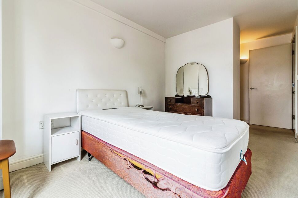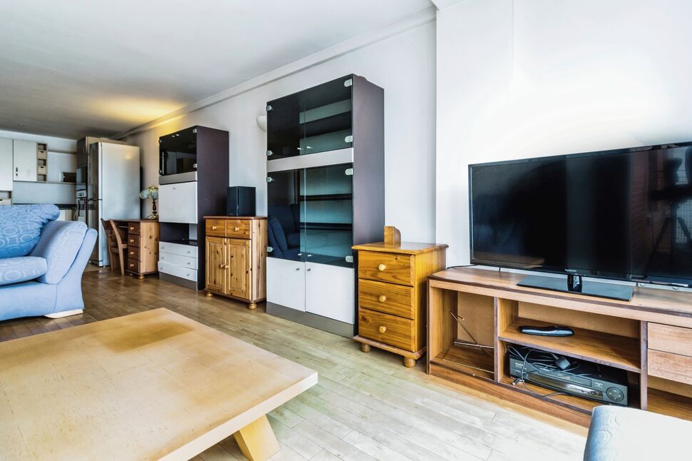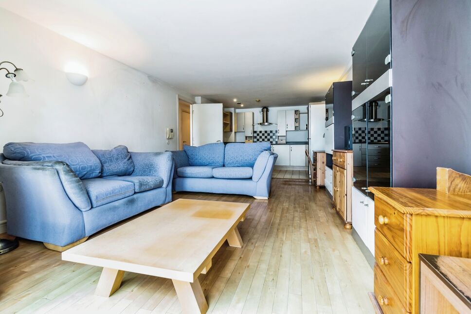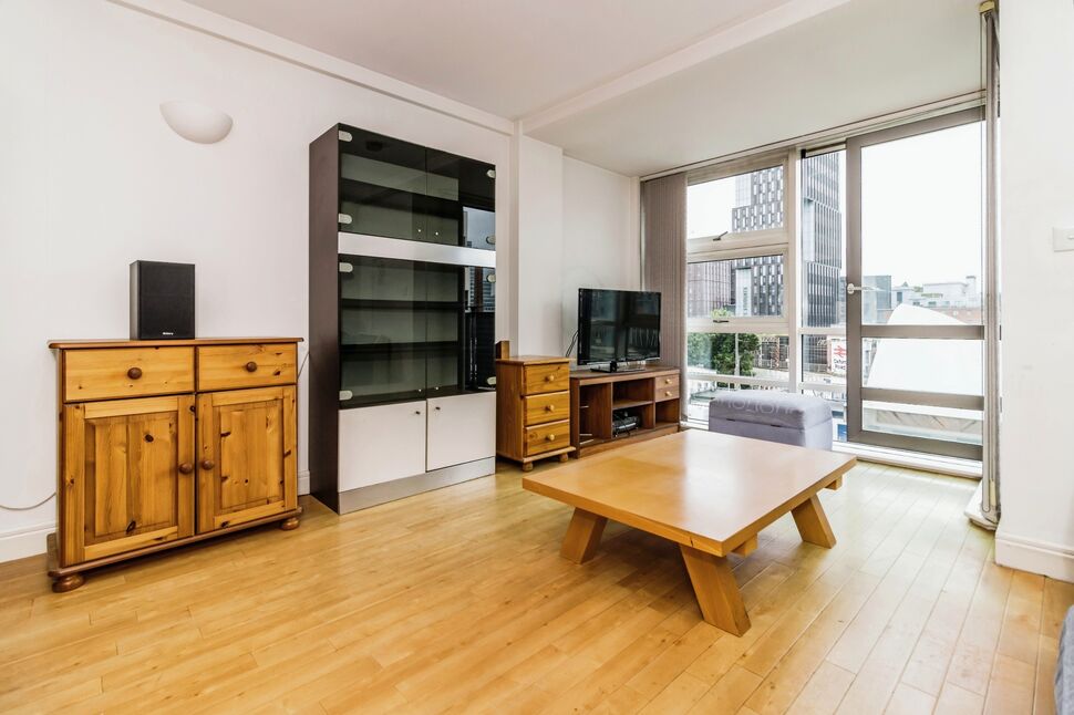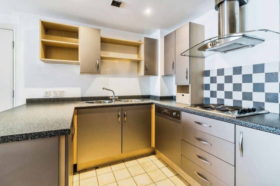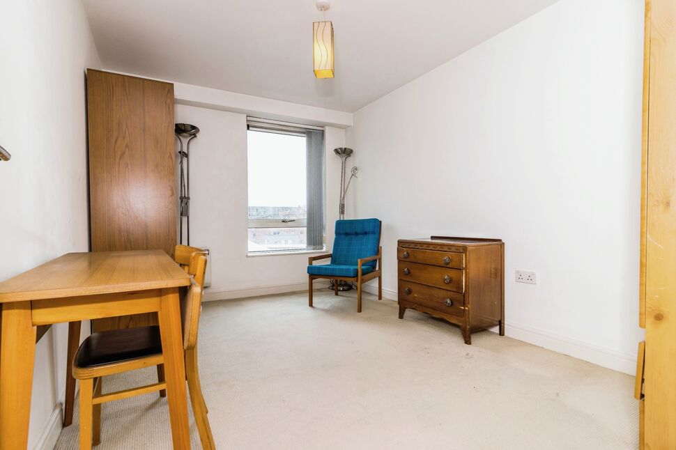 Flexible and spacious layout which can easily accommodate living and dining furniture. Full-height window to the front elevation with views of the city skyline. The living area has wooden-style flooring to match the hall with wall uplighters, two electric heaters and entry intercom system. The open-plan kitchen has a range of fitted base and wall units, integral electric oven and hob with extractor hood, circular sink with mixer tap, integral dishwasher, tiled flooring, recessed downlighters.