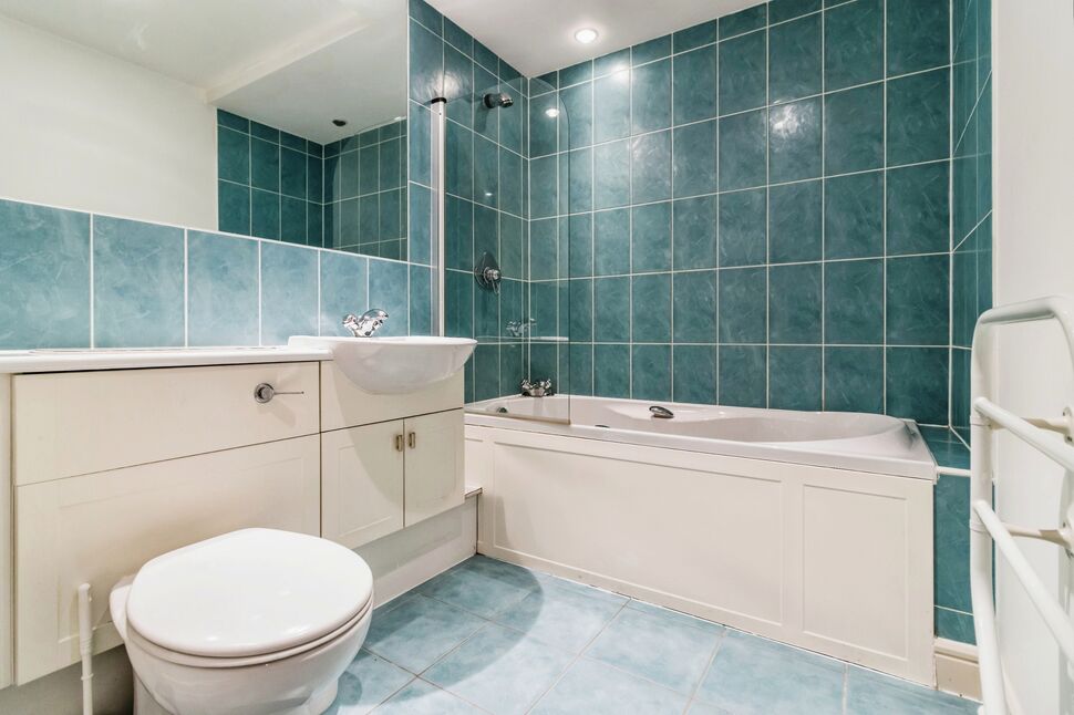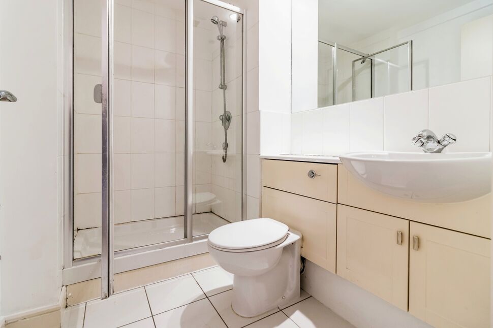 Shower cubicle, wash basin with mixer tap, WC, shaver point, tiled splashbacks and flooring, heated towel rail.