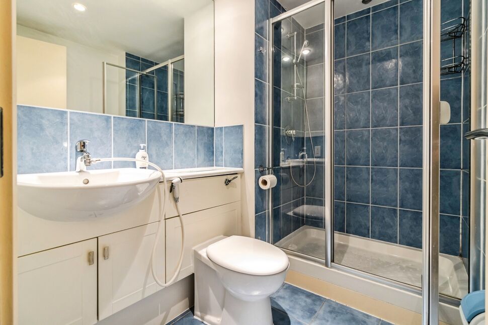 Shower cubicle, wash basin with storage below, WC, tiled splashbacks and flooring.