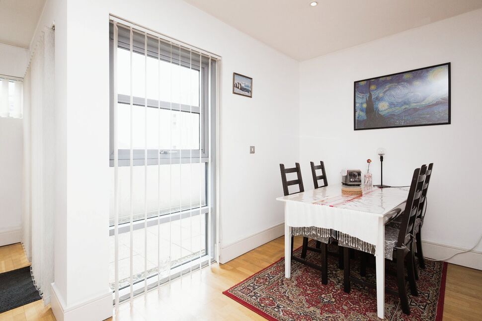 Very spacious design with scope for distinct living and dining areas. Window to the front elevation and floor-to-ceiling window looking out onto the private balcony. Wooden-style flooring. Open-plan kitchen with fitted base and wall units, integral electric oven and hob with extractor hood, inset circular sink with mixer tap, worktop lighting, integral dishwasher, space for a fridge/freezer.