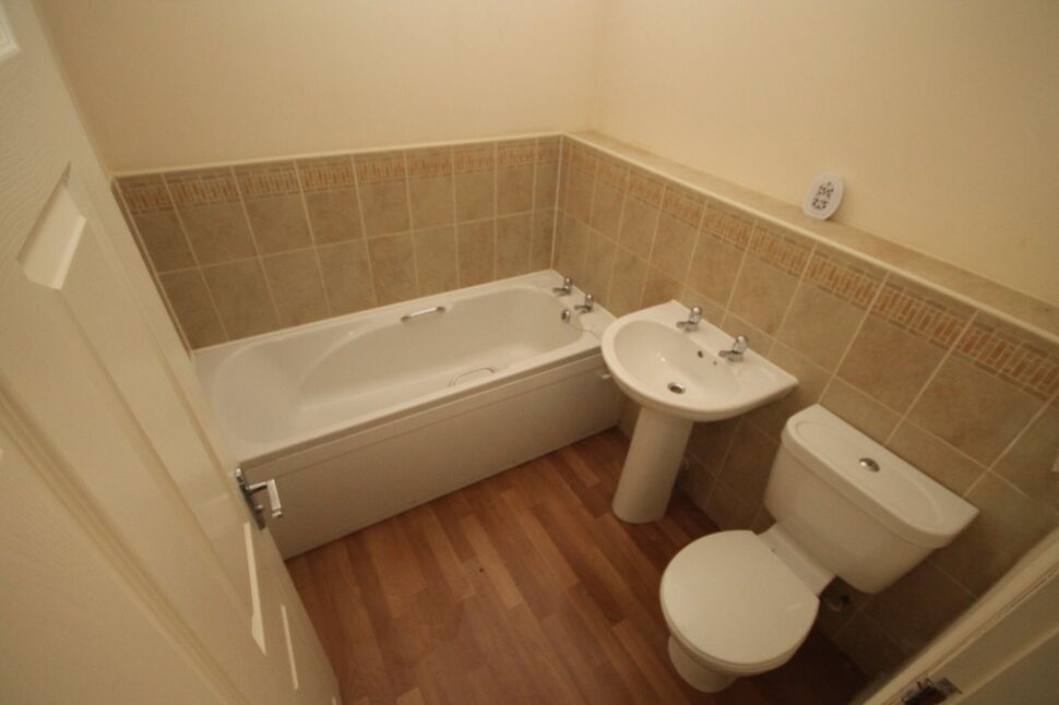 The main bathroom is fitted with a classic three-piece white suite comprising a bath, wash basin, and WC. The area is fully tiled around the suite, offering a clean and practical finish.