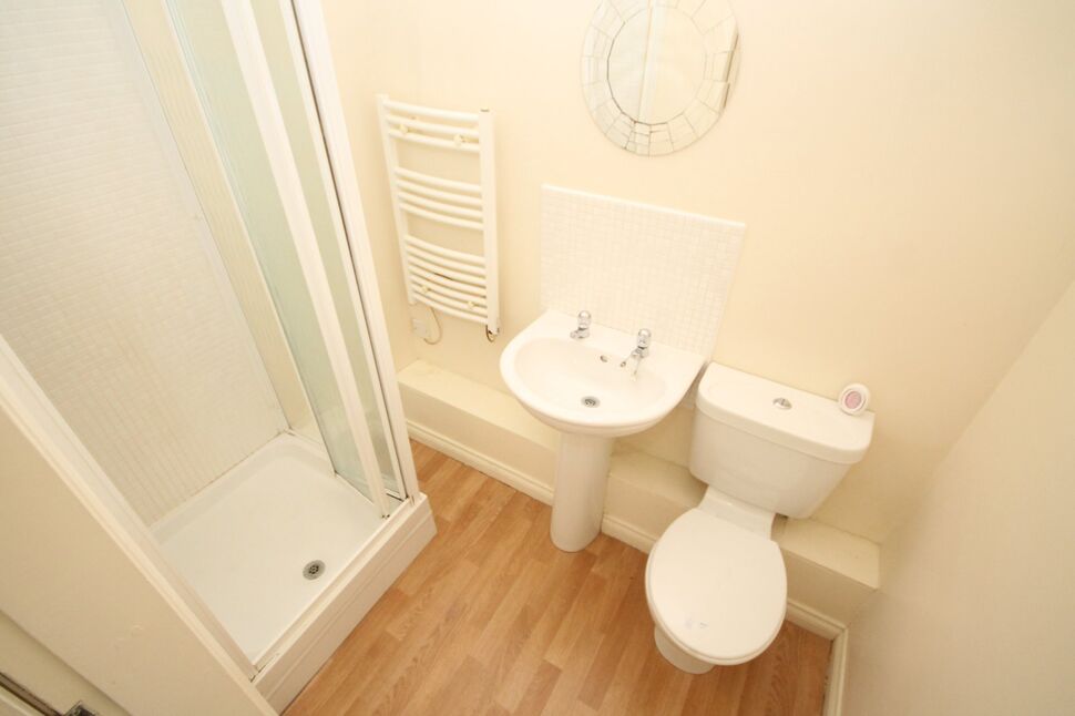 The en-suite bathroom is fitted with a modern two-piece white suite, including a wash basin and WC, complemented by a separate shower cubicle.