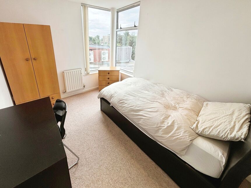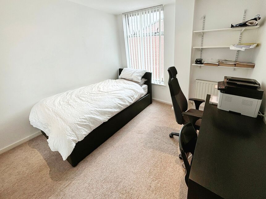 The master bedroom is a spacious and inviting retreat, offering ample room for all your bedroom furnishings. Dual aspect windows provide abundant natural light and offer charming views of the back streets of Didsbury Village, creating a peaceful and private atmosphere.