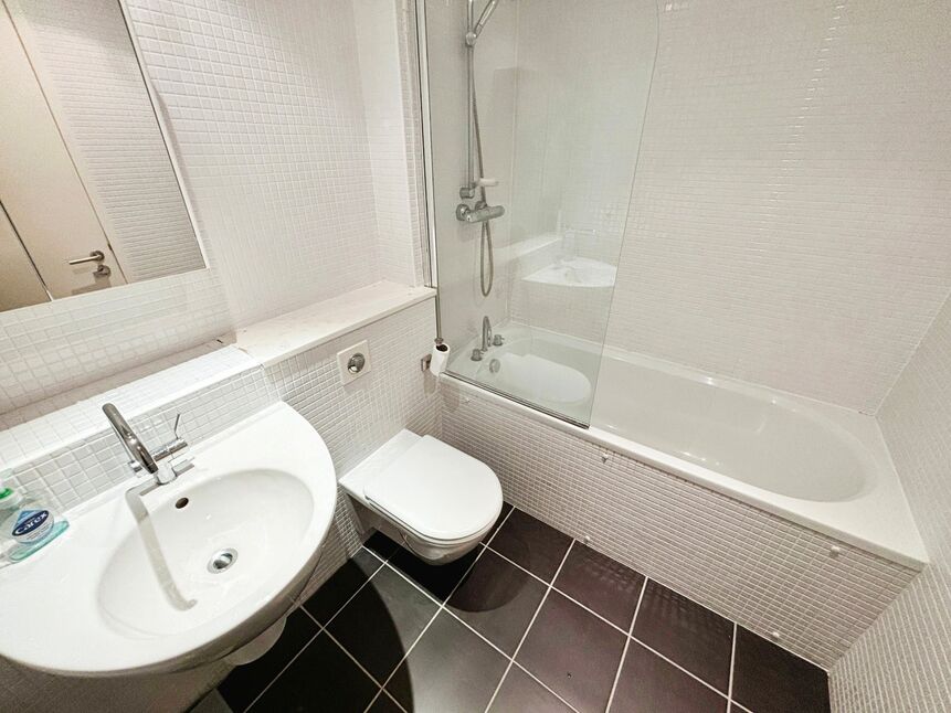 The living/kitchen area of this penthouse is a bright, open space flooded with natural light, thanks to expansive floor-to-ceiling windows. French doors lead directly onto the balcony, creating a seamless connection between indoor and outdoor living. The kitchen has integrated appliances such as oven, hob, extractor fan and dish washer and effortlessly flows into the living area, making it perfect for both relaxed evenings and entertaining guests.