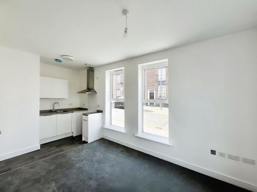 Two windows to front and side aspect. Heater. Grey carpeted flooring. Kitchen area has grey laminate flooring and a range of white wall and base units with cooker and extractor. Fitted blinds