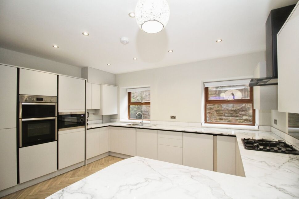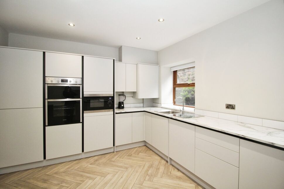 Modern wall and base units with all integrated appliances, stainless steel single drainer and mixer tap. Dining worktop with seating area. Double glazed window.