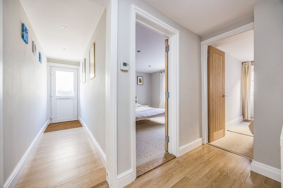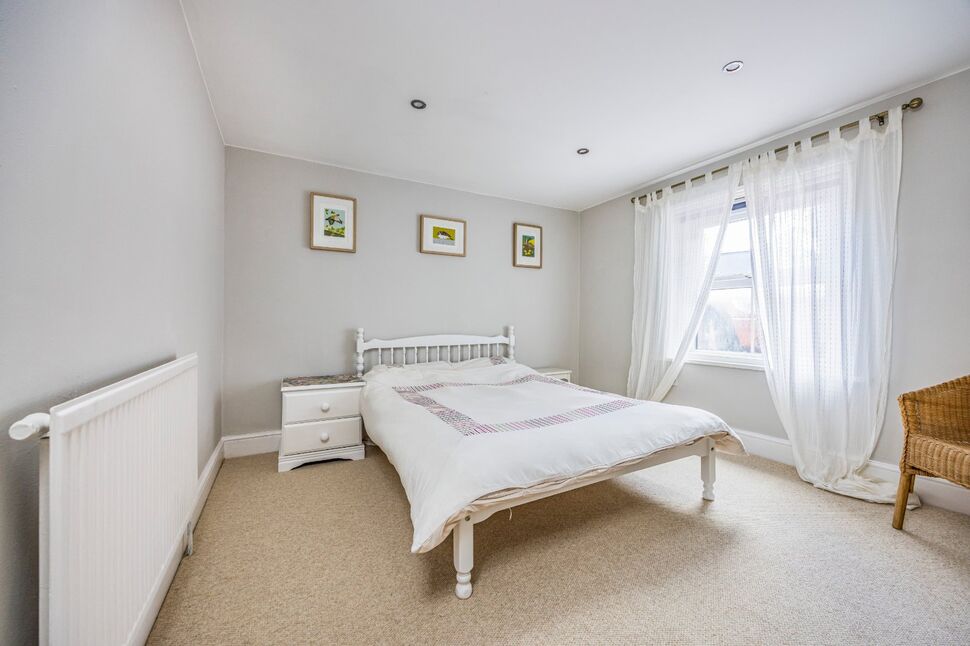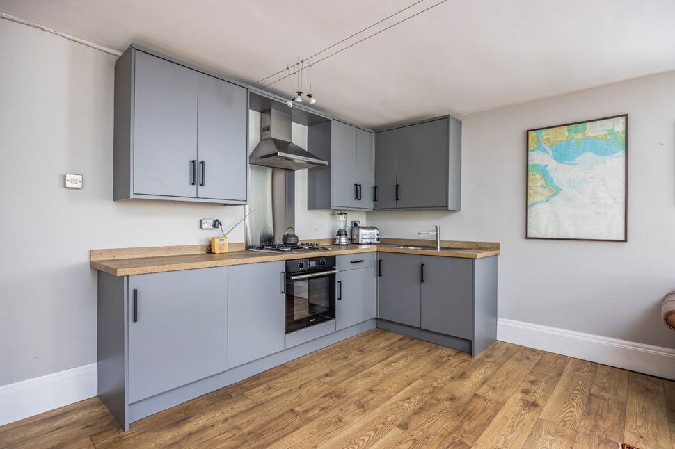 A great space with its west facing bay allowing much in the way of natural light. More than enough space for sofas and dining room table and chairs. Wood style flooring and additional window to side. The kitchen itself offers a great range of base and eye level units under wood style square edge worksurfaces, single sink, built in oven and hob plus extractor. An integrated fridge freezer completes the kitchen.
