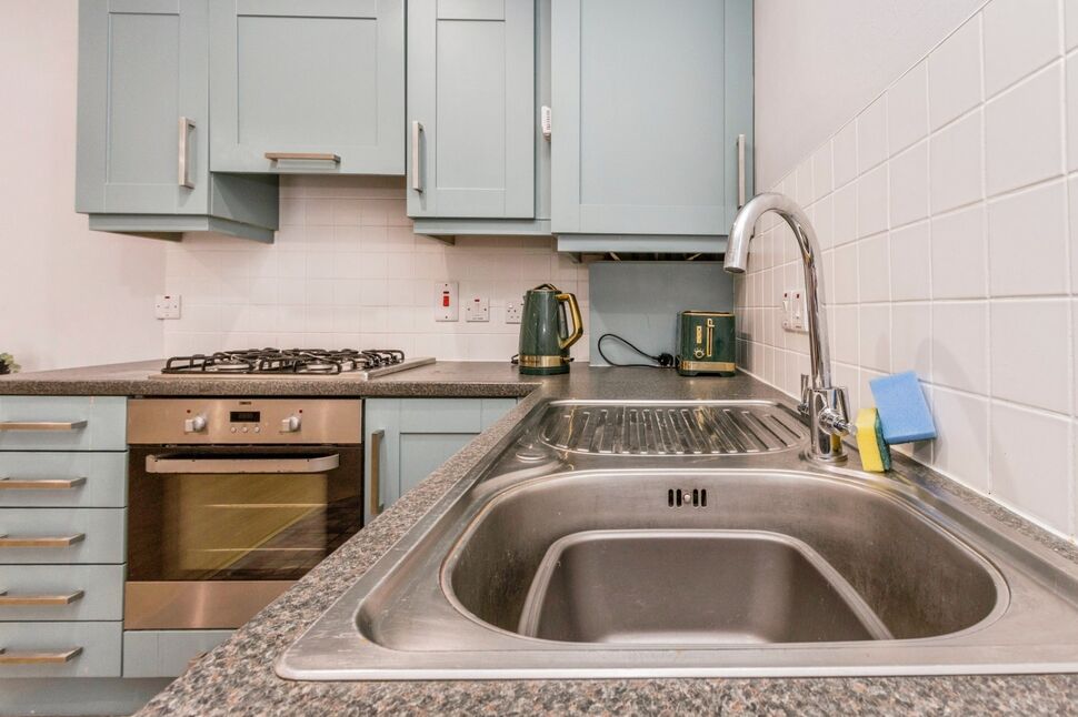 A superb open plan living space with laminate flooring, ceiling spotlights, french doors and Juliet balcony. The kitchen has been beautifully cared for and offers a wide range of high and low level units, single basin with mixer tap, and an electric hob and oven. There is also a dishwasher and the kitchen has been plumbed for the washing machine.