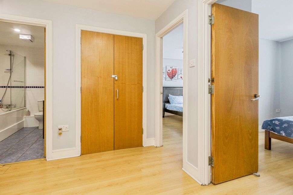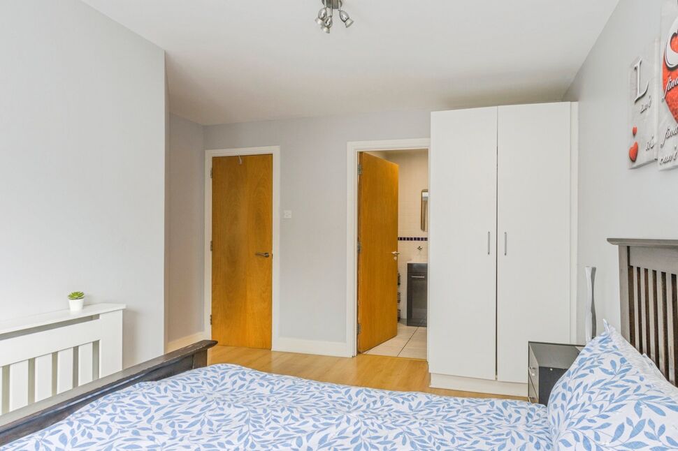 An impressive master bedroom with french doors, Juliet balcony and laminate flooring. There is also a convenient ensuite shower room.