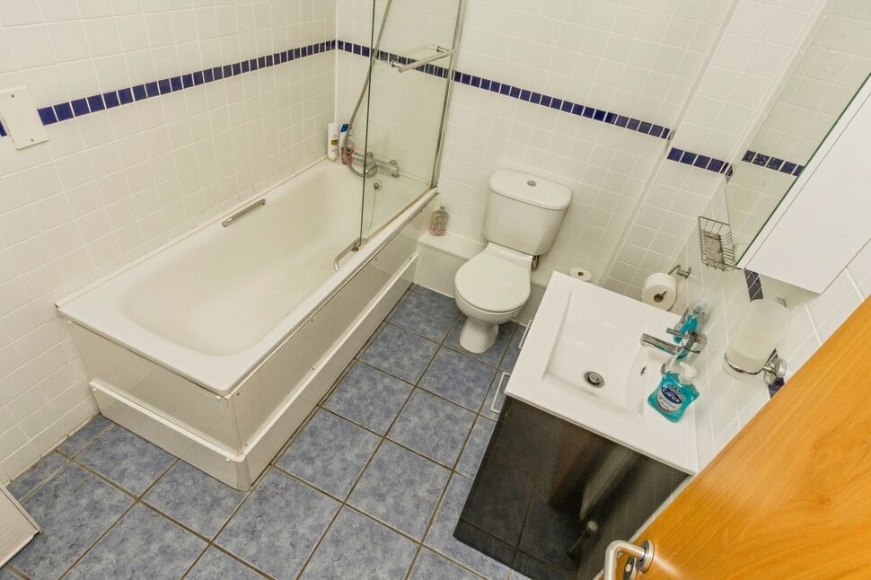 The bathroom has a three-piece white suite to include a wall mounted wash hand basin with mixer tap and vanity unit, a low flush wc, and a bath with an overhead shower head. The bathroom has been fully tiled.