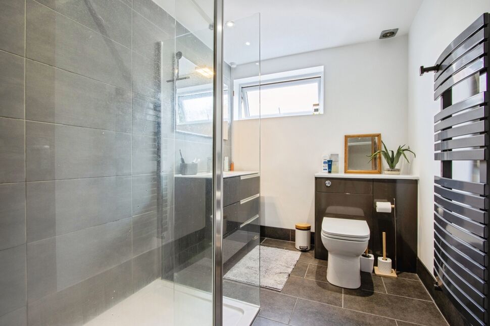 Contemporary family bathroom with walk-in shower, glass screen, electric shower controls, vanity wash hand basin, WC, and tasteful tiled splashbacks and flooring.