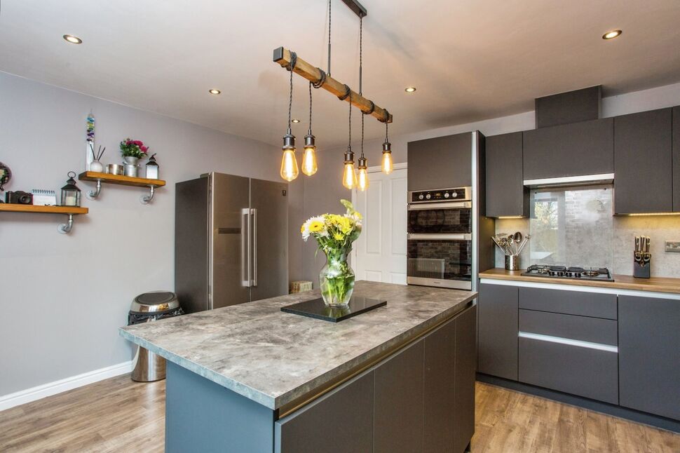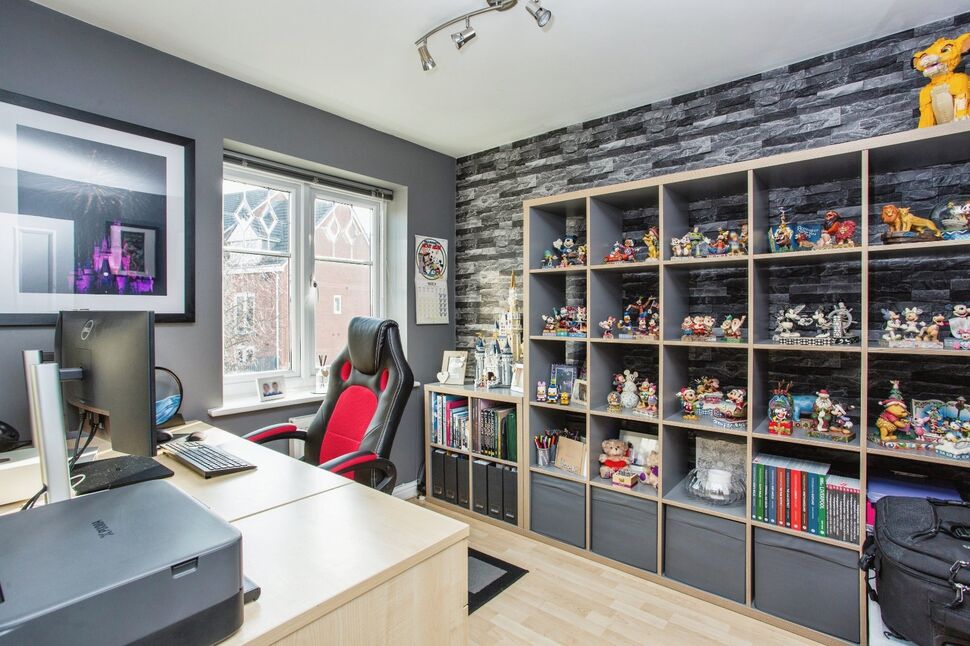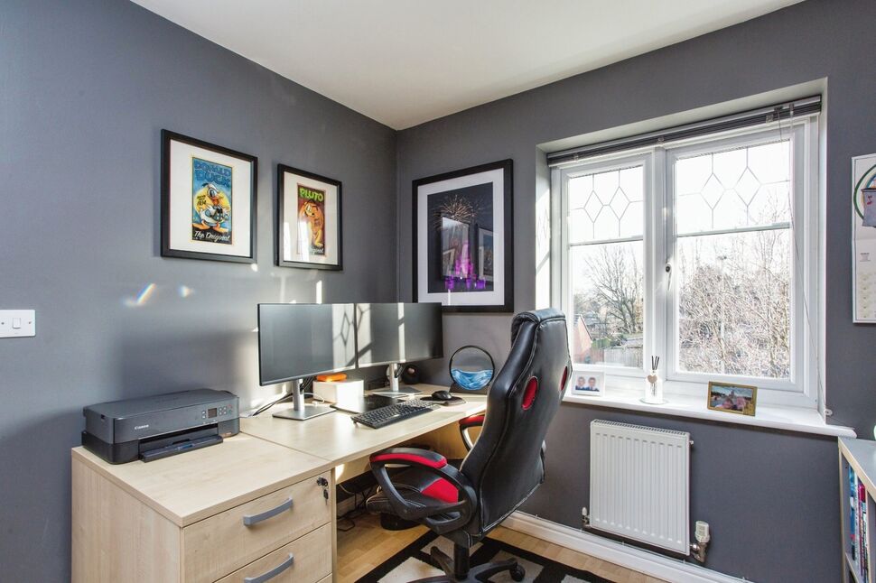 The property comprises entrance hall, spacious modern fitted kitchen with island in central position, and patio doors leading to the low maintenance and well-presented rear garden as well as ground floor bedroom/office space and cloakroom.