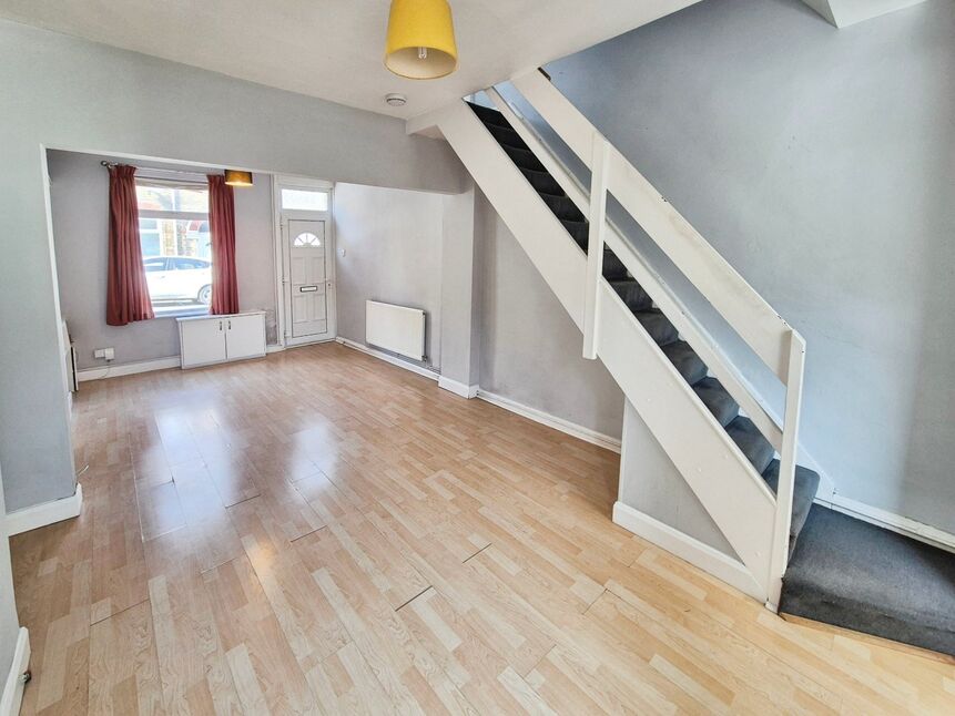 The laminate flooring continues from the living area, with central heating radiator, external double glazed door leading to the rear courtyard and staircase to the first floor.