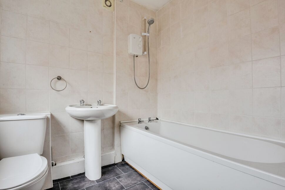 Double glazed obscure window to side, fully tiled walls and having panel bath with shower over, pedestal wash hand basin, WC, radiator.