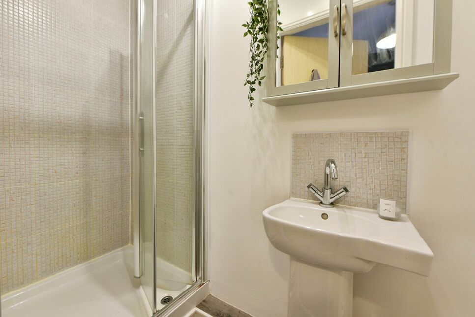 A three piece suite of shower cubicle, wash basin and low level wc, Radiator.