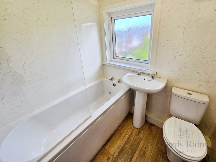 Upstairs, you’ll find two good-sized bedrooms. The main bedroom is particularly spacious and would comfortably fit a double bed along with other furnishings. The second bedroom also offers flexibility and could be used as a guest room, home office, or child’s bedroom. The bathroom, accessed via the landing, is fitted with a white suite and provides another opportunity for refurbishment to suit your taste.