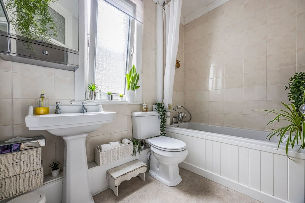 Finished in white with a panel enclosed bath, low level W/C and wash hand basin. Feature tiling and window to side.