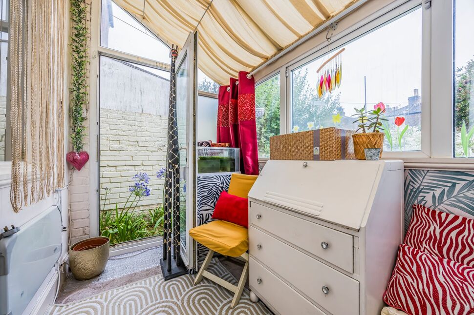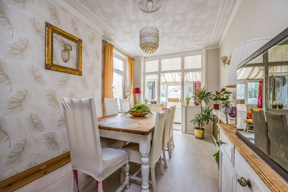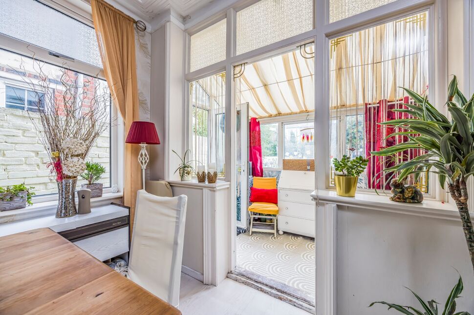 A pretty room with its cream flooring and dual aspect windows. More than enough space for a large dining room table and chairs. Leading to the conservatory.