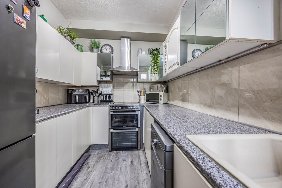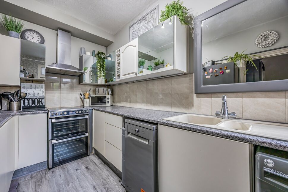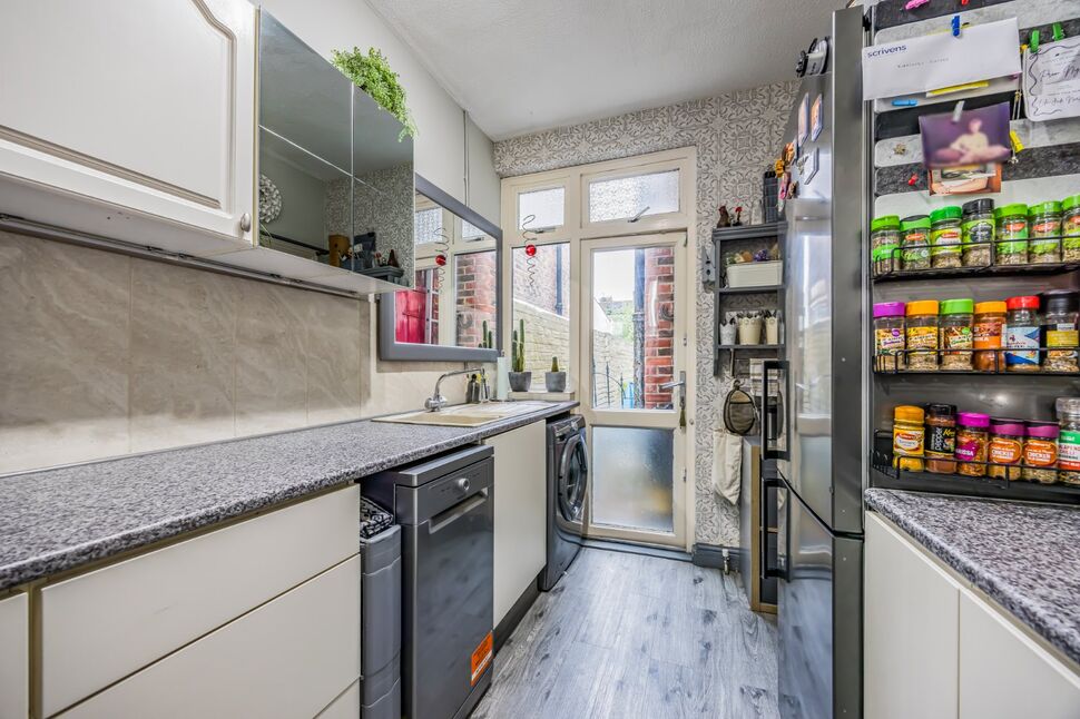 A modern design with a great range of base and eye level units under roll edge worksurfaces, one and a half sink, space and plumbing for dishwasher and washing machine. Cooker point, space for tall fridge freezer. Feature tiling and door to rear garden.